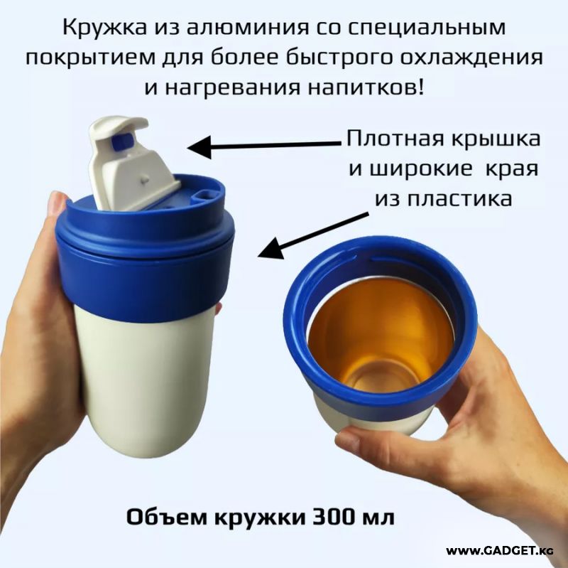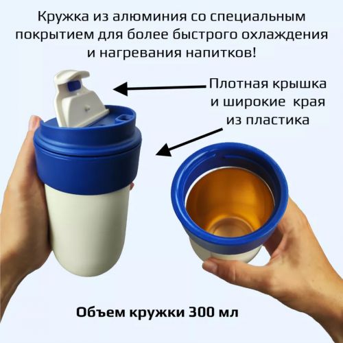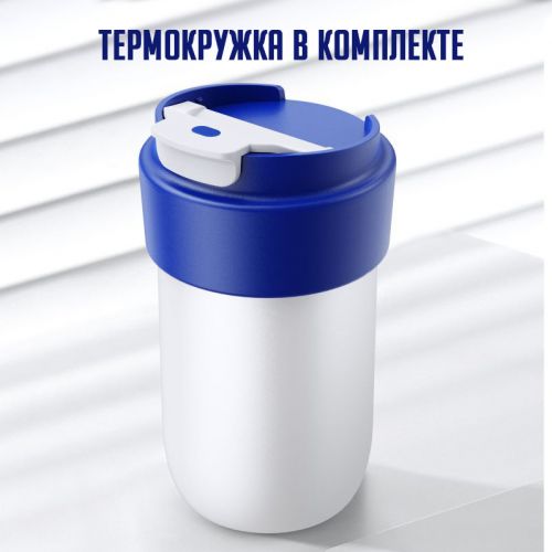 Жылыткыч менен комплектте термокружка келет, ал сиздин ичимдигиңиздин температурасын узак убакыт бою сактайт. Комплекттеги кружка алюминийден жасалган жана атайын каптоо менен жабдылган, бул муздатууну жана жылытууну тездетет. Ал ыңгайлуу капкагы жана ысык ичимдиктерди ичүү үчүн кең жээктери менен жабдылган, кружканын көлөмү 300 мл.