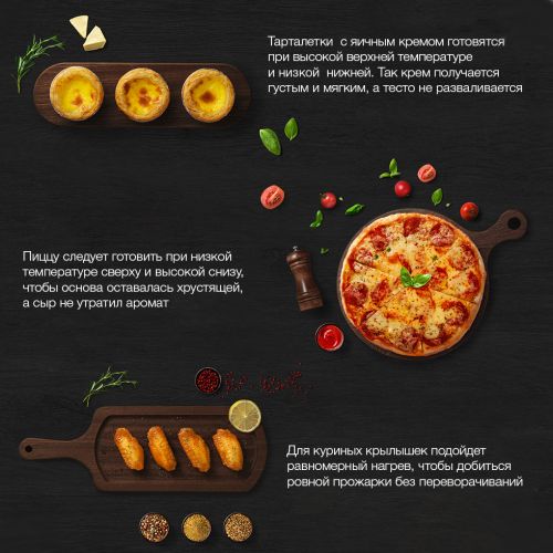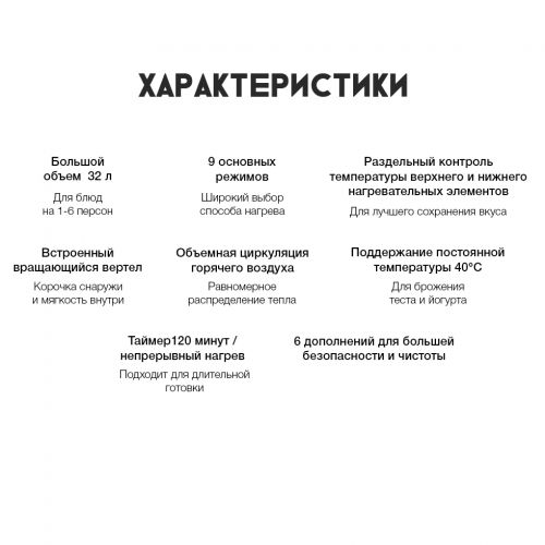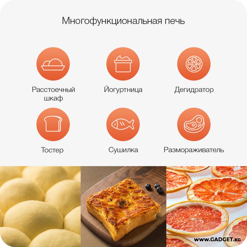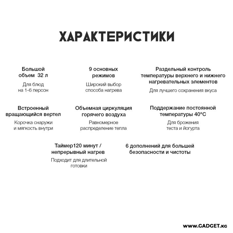 Мешке 3 противень киргизүүгө болот, ошондуктан сиз 3төн 6 адамга чейин коноктор үчүн каалаган тамакты даярдай аласыз. Өндүрүүчү 9 негизги режим жана жылытуу ыкмаларын караган. Бул сизге эң оптималдуу даярдоо вариантын тандоого мүмкүндүк берет.