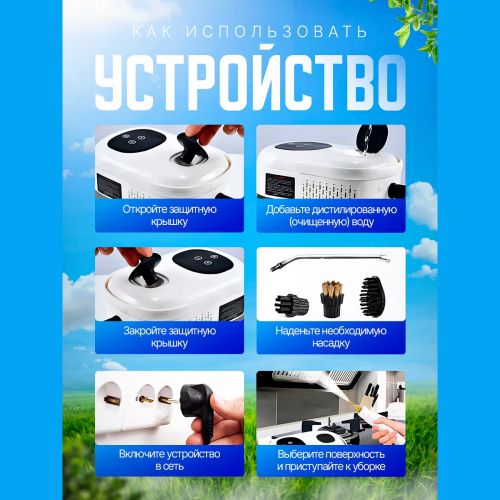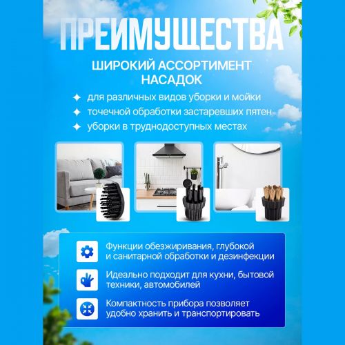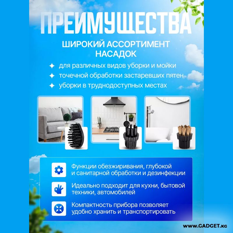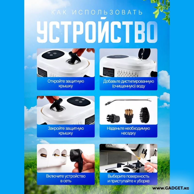 Колдонуу чөйрөсү: айнектерди жана айнадарды тазалоо; мештерди, СВЧ, плиткаларды жана муздаткычтарды тазалоо; душ, ванна, суу куюучу крандарды, кафель плиткаларын тазалоо; оюнчуктарды, мебельдин каптоосун тазалоо; текстиль буюмдарын, перделерди, драпировкаларды, дасторкондорду буулантуу; плиткалардын ортосундагы шовдорду тазалоо; кыйын жеткиликтүү жерлерди жана бурчтарды тазалоо; күйүк жана калдыктарды, тамак-аштын жабышкан калдыктарын тазалоо; катуу полдорду тазалоо жана килемдерди жаңыртуу жана башка көптөгөн иштер.