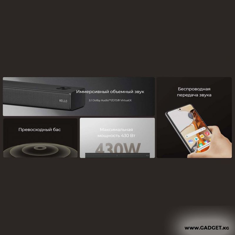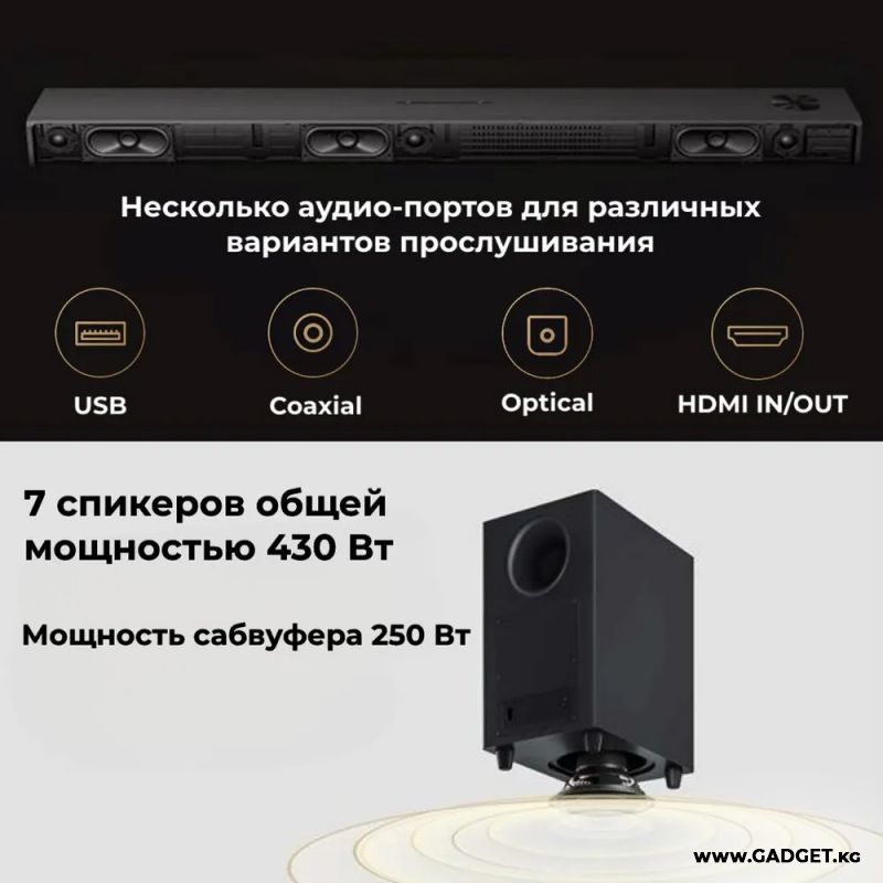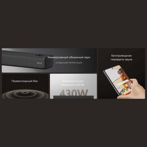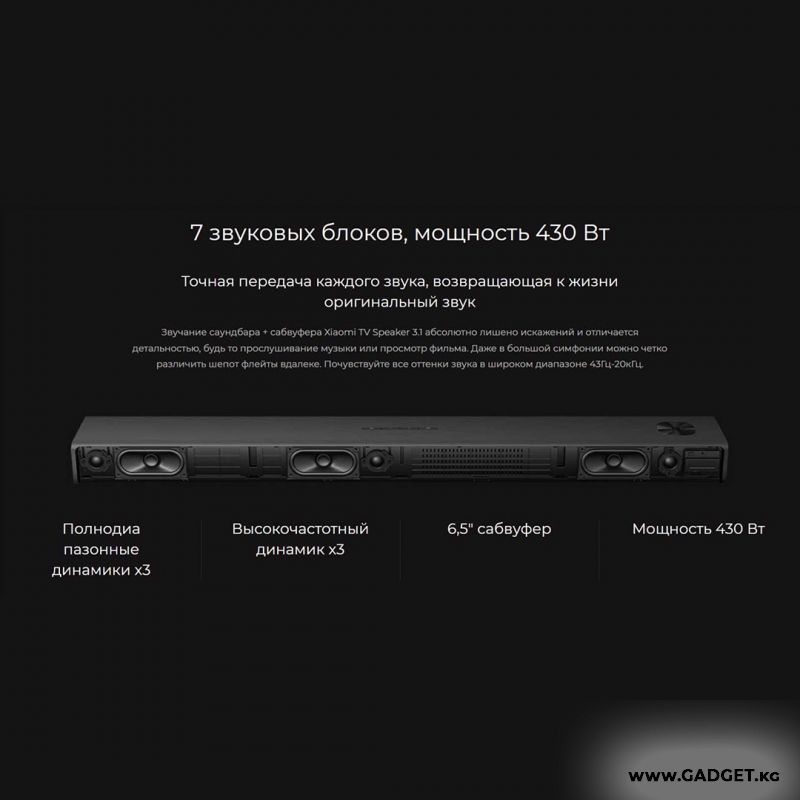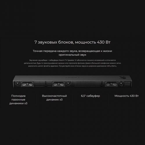 Xiaomi Soundbar 3.1 үч толук диапазондуу динамик, үч жогорку частоталарды ойногон динамик жана басын күчөтүү үчүн өзүнчө сабвуфер менен жабдылган. Сиз музыка угуп жатасызбы, фильм көрүп жатасызбы же оюн ойноп жатасызбы, ар бир үндү так угасыз. Жүйөлүү системанын максималдуу кубаттуулугу 430 Вт, бул сизге жаркын жана күчтүү үн менен унутулгус таасирлерди камсыз кылат.
