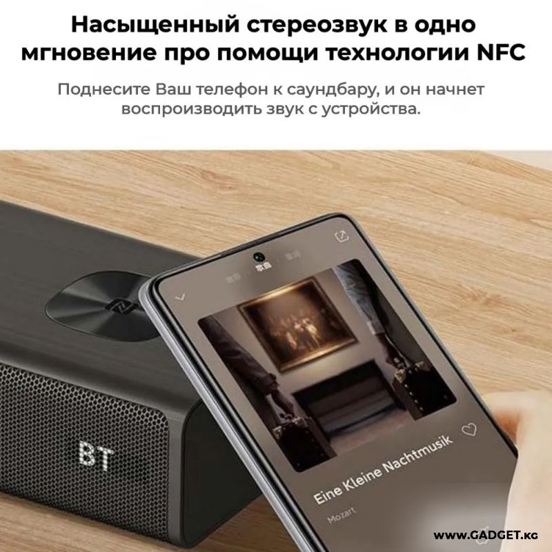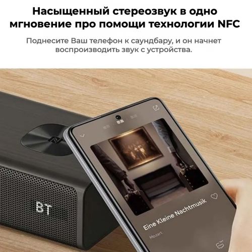 Эми сиз мобилдик телефонду саундбарга музыка өткөрүп, укмуштуудай үн менен ырахат ала аласыз. Смартфонуңузду NFC радиусунда кармап, мобилдик түзмөктөрдөн ойногондо жеткиликтүү эмес сапатта сүйүктүү хиттерди угууга болот.