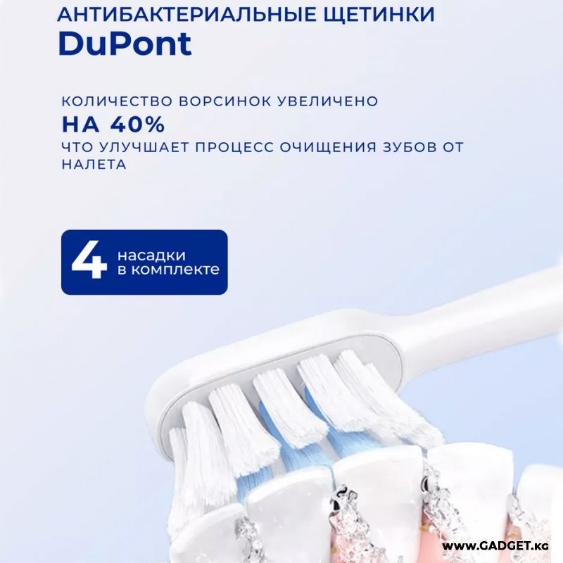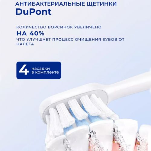 Электрическая щетка Mijia T302 оснащена насадкой с гигиеничной, безопасной, антибактериальной, неметаллической конструкцией. В частности, количество ворсинок DuPont на головке щетки увеличилось на 40%, что улучшит процесс очистки зубов от налета.