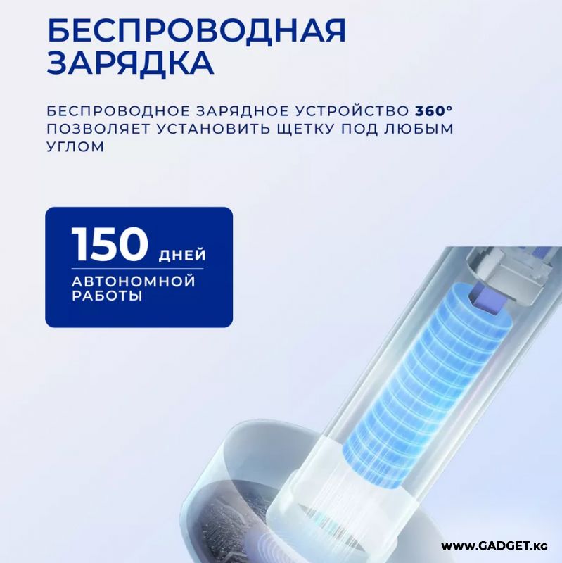 Устройство способно работать до 150 дней автономно при использовании режима бережной очистки и до 65 дней в стандартном режиме использования. Удобно брать с собой в поездки не беспокоиться о зарядке щетки.
