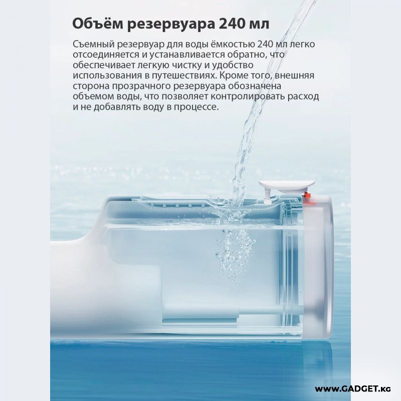 Съемный резервуар для воды ёмкостью 240 мл легко отсоединяется и устанавливается обратно, что обеспечивает легкую чистку и удобство использования в путешествиях. Кроме того, внешняя сторона прозрачного резервуара обозначена объемом воды, что позволяет контролировать расход и не добавлять воду в процессе.