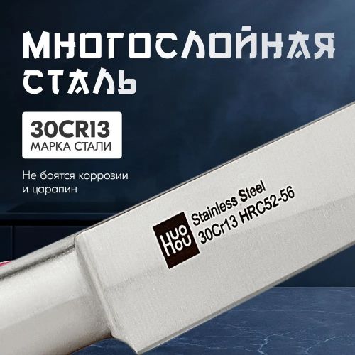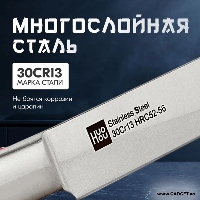 HU0095 кухондук нождору 30Cr13 болоттон жасалган, ал медицинада колдонулат. Huo Hou компаниясынын жогорку көмүртектүү болоттон жасалган кухондук буюмдары коррозияга учурабайт, узак убакытка чейин эскирбейт жана жогорку температураларга туруштук берет. HU0095 кухондук нождор топтомунун жогорку күчү мартенсит болоттун эсебинен гана эмес, ошондой эле бардык кухондук аспаптарда материалдын көп катмарларын колдонуу менен камсыздалат. Мындай технология фигуралык кесүү үчүн эң кичинекей нождо жана этти кесүү үчүн нождо да бар. Ошентип, жээктерди абдан жука жана курч кылууга мүмкүнчүлүк пайда болот, бир убакта алардын катуулугун сактап, эң катуу азыктарды кесүүгө мүмкүнчүлүк берет. Бул комплекттеги кайчыдан башка бардык кухондук жабдыктар толугу менен болоттон жасалган, бул комплекттин элементтерин узак мөөнөттүү кылат. Нождор үчүн подставка да болоттон жасалган жана интенсивдүү колдонууга ылайыкташтырылган.