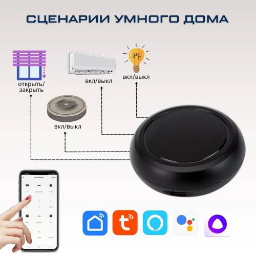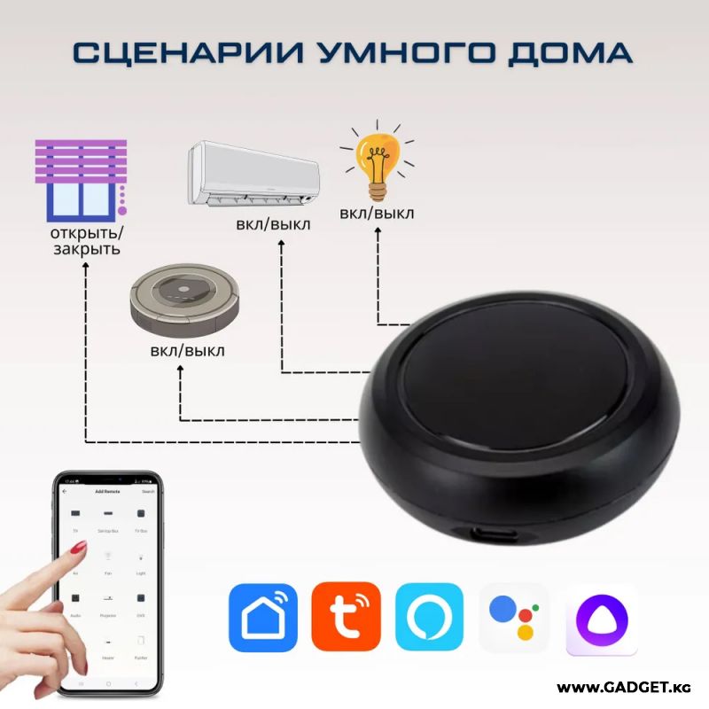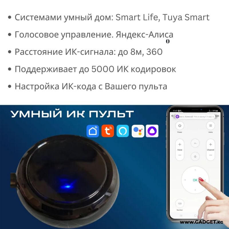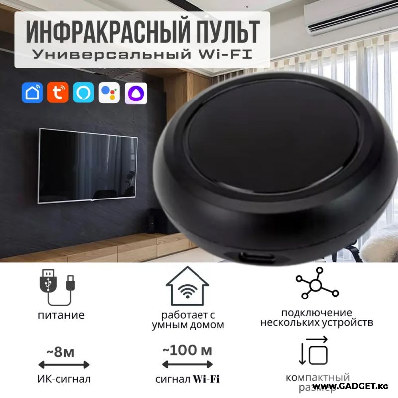 Умный ИК пульт дистанционного управления WI-FI Tuya / Smart life — бул көп функциялуу түзүлүш, смартфон аркылуу акылдуу үйдүн тиркемеси аркылуу үй техникасын башкарууга мүмкүнчүлүк берет. Пульт көптөгөн түзүлүштөр менен шайкеш келет, мисалы, телевизорлор, кондиционерлер, вентиляторлор, STB, TV Box жана башка көптөгөн түзүлүштөр, анткени 4000ден ашык бренддердин жана 50 000 коддун кеңири ИК-коддор базасын колдойт, бул коддор туруктуу түрдө булут аркылуу жаңыртылып турат.