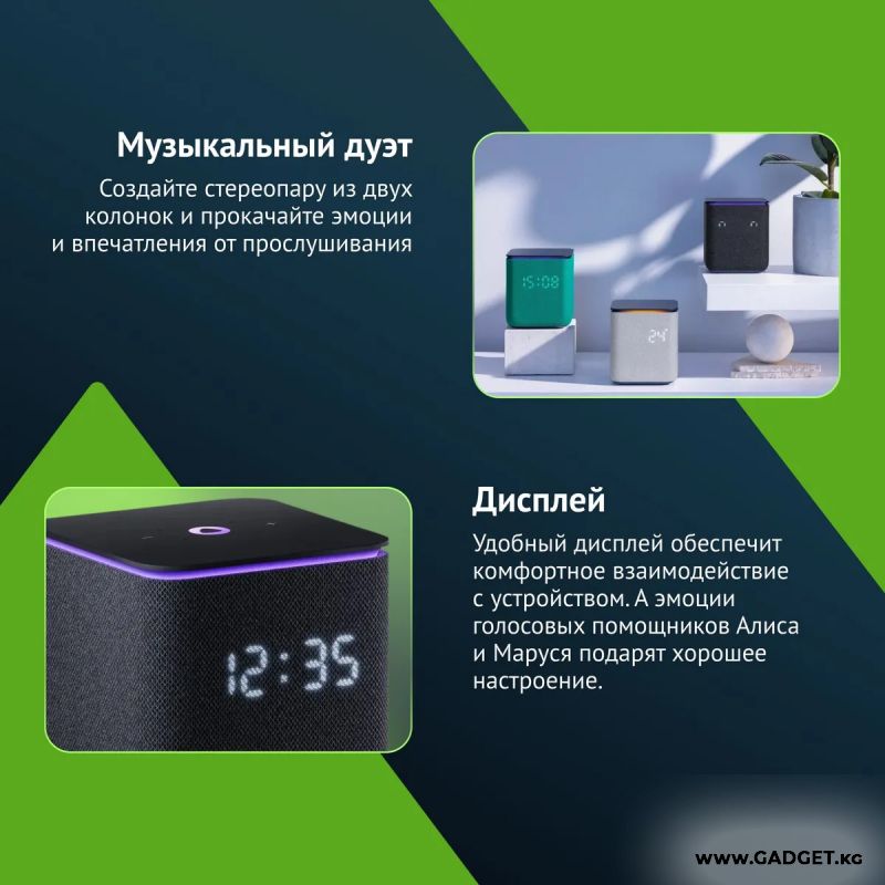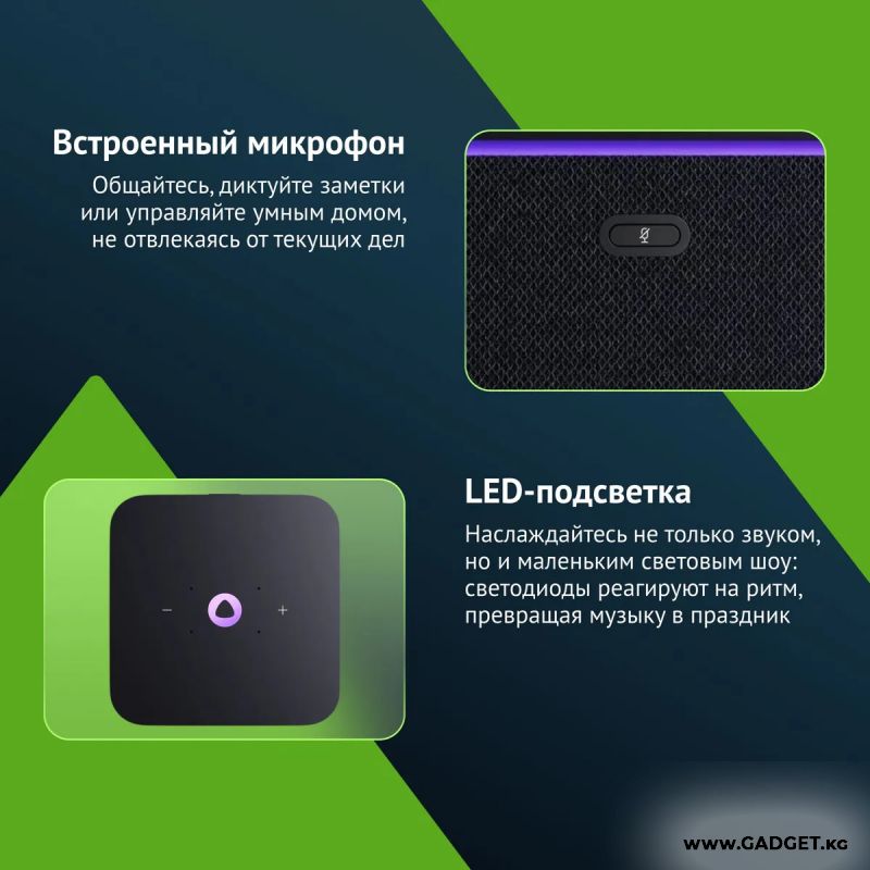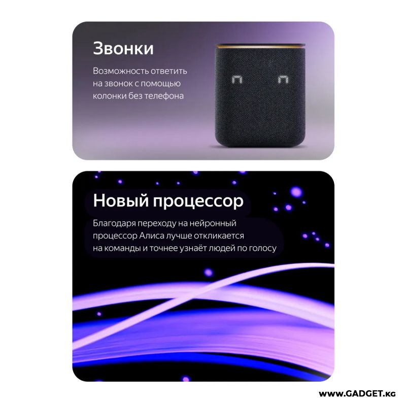 Мындай компакттуу корпусунда 24 Вт күчтүү үн. Нейрондук процессор, анын жардамы менен Алиса сиздин буйруктарыңызга дагы так жооп берет жана суроолоруңузду иштетет. LED-дисплей, убакытты, аба ырайын жана Алисанын реакцияларын көрсөтөт, ошондой эле активдүү контурдук LED-лампочка.