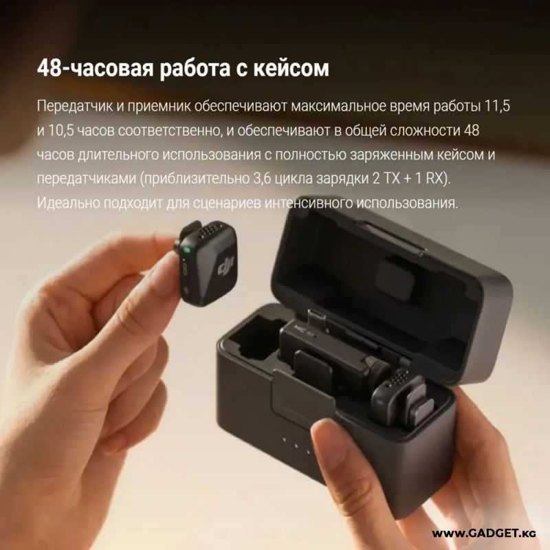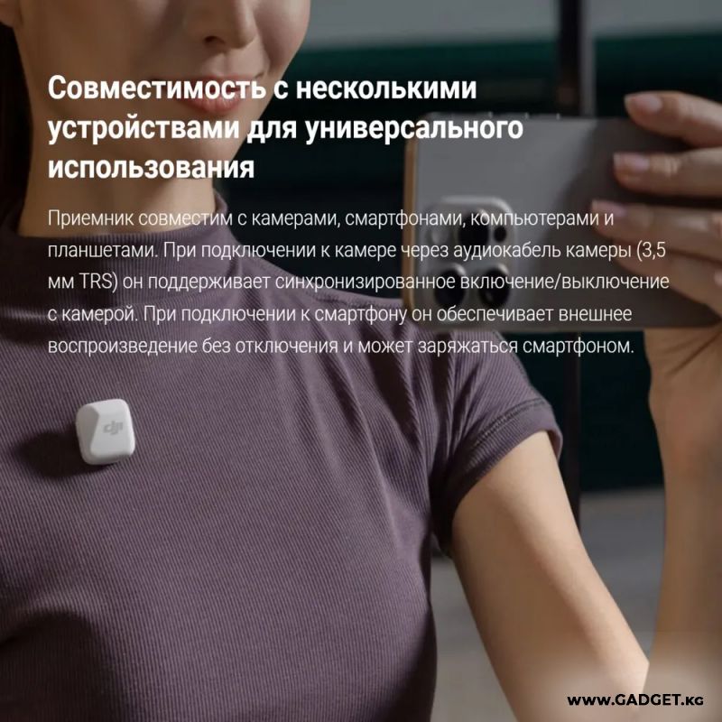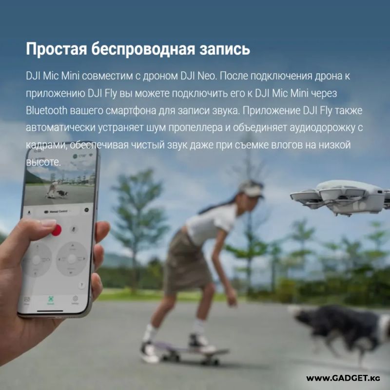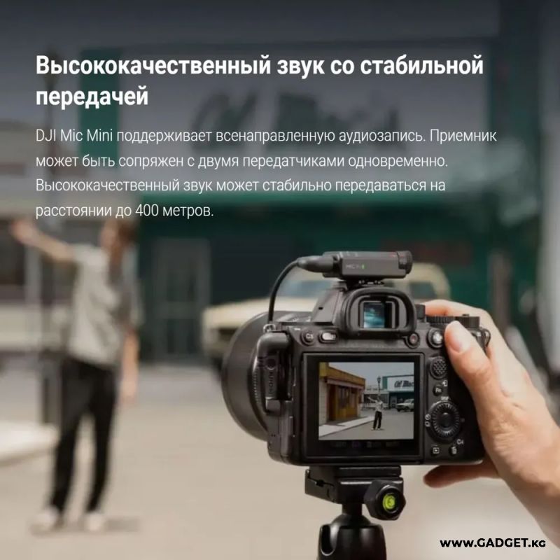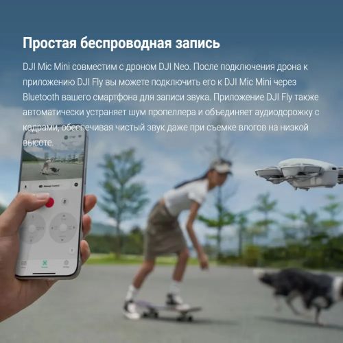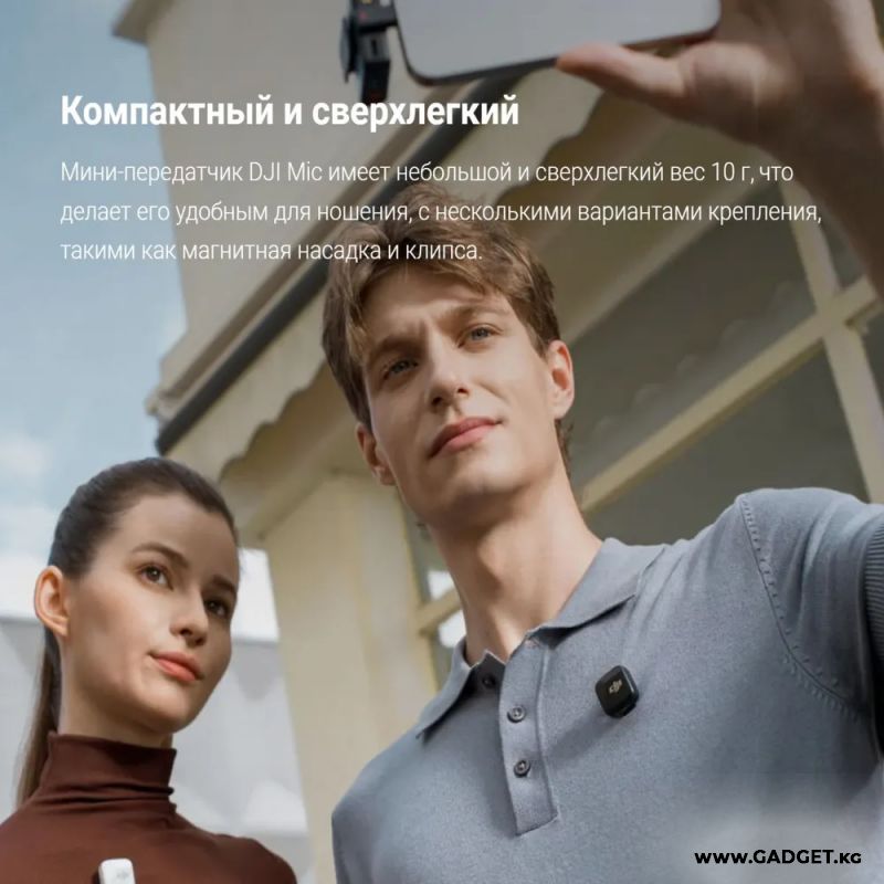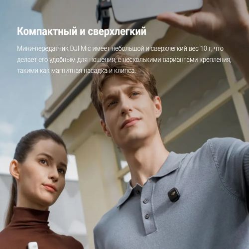 DJI Mic Mini — ультракомпакттуу жипсиз өткөргүч, салмагы болгону 10 г, блогерлер, влогерлер жана контент-креаторлор үчүн идеалдуу. Анын жардамы менен мобилдик тартуулар учурунда жогорку сапаттагы аудиону оңой эле жазып алууга болот. Микрофон магниттик бекитүү жана кыстыргыч менен жабдылган, бул колдонууда ыңгайлуулукту камсыз кылат. Интервьюлар, жүрүп жаткан тартуулар жана камералар менен смартфондордо иштөө үчүн идеалдуу.