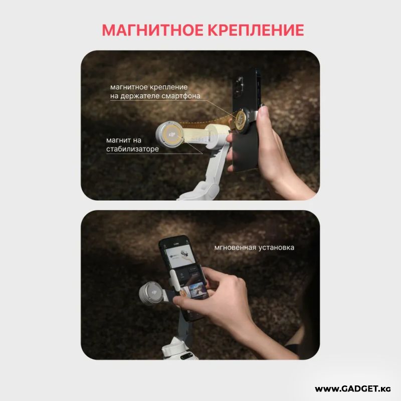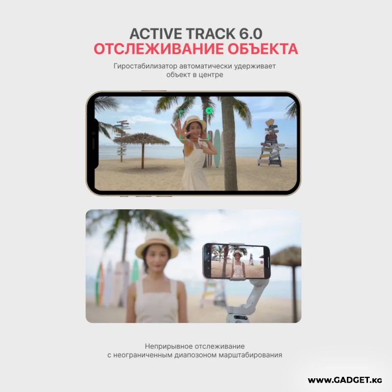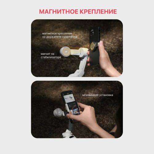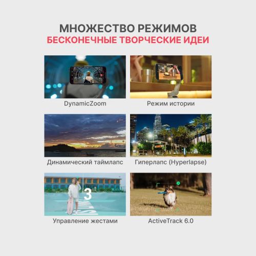 Osmo Mobile SEнин жеңил бүктөлүүчү корпусу жана ылдам алып салынуучу магниттик кармагычы, транспорттоого ыңгайлуу болуп, тартуу үчүн бир нече мүнөттүн ичинде даярданууга мүмкүндүк берет. Жаңы статус панелинин жардамы менен стабилизатордун режимин бир басуу менен алмаштырууга болот, ал эми акылдуу функциялар өзгөчө учурларды тартууга жардам берет.