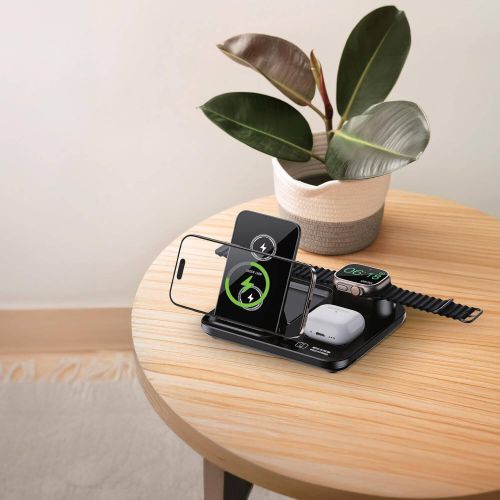 Кабелдерден, өтмөктөрдөн жана Apple түзмөктөрүңүз үчүн керектүү розеткалардан кутулуңуз. Эми сиз бардыгын бир комплектте ала аласыз. Бул зымсыз заряддоо станциясынын жалпы кубаттуулугу 15 Вт жана iPhone смартфонуңузду, Apple Watch акылдуу саатын, AirPods үчүн зымсыз заряддоо панелин камтыйт.