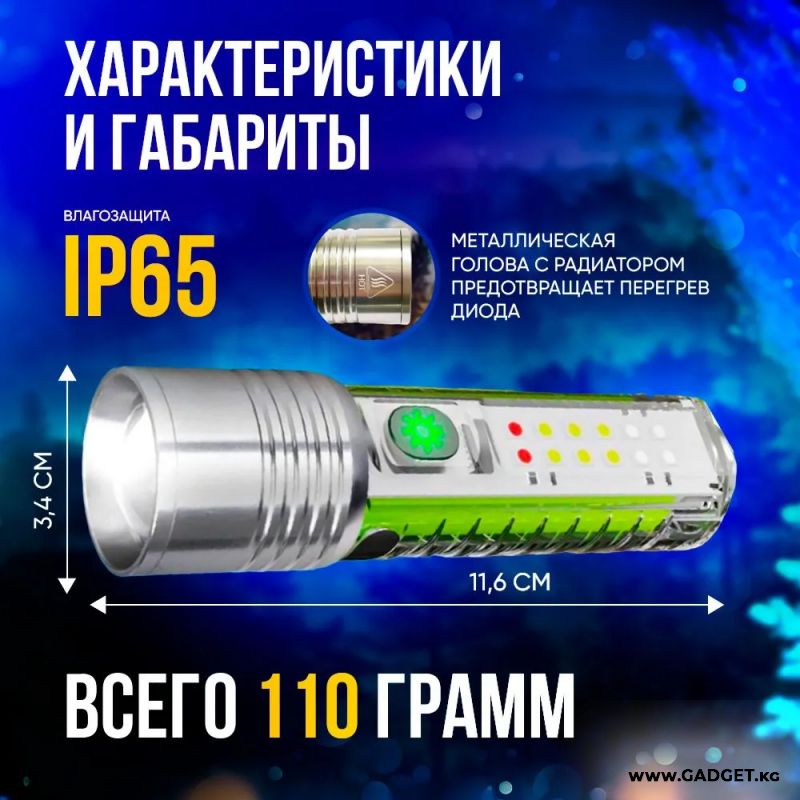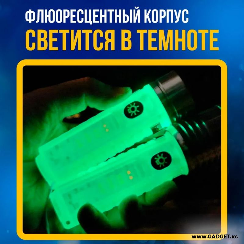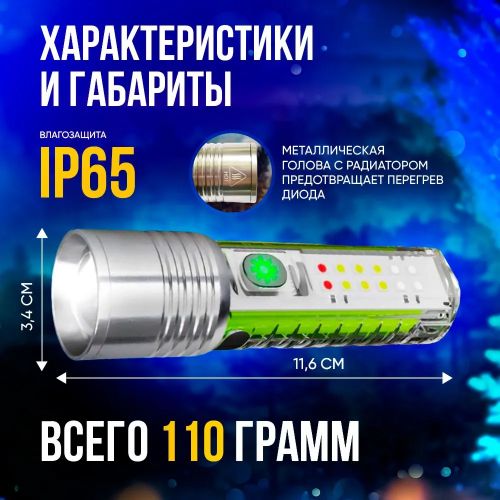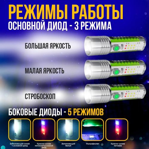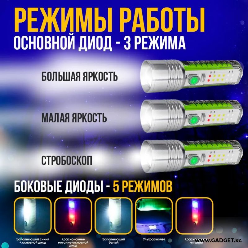 Күчтүү светодиоддук аккумулятордук фонарик азыркы учурда компакттуу корпус менен. Фонарик 8 режимде иштейт - 3 режим негизги фонарик - жаркын, орто, стробоскоп жана 3 режим СОВ жарык - ультрафиолеттик, ак, мигаган кызыл көк. Фонарик караңгылыкта жаркырайт.