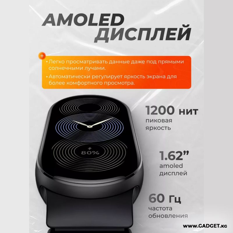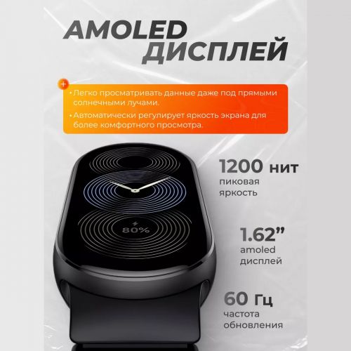 AMOLED-дисплейдин чокусунан жарыктык 1200 нитке чейин жетет: актуалдуу маалыматтар күндүн жарыгында, түз бурчта түшкөндө да жакшы көрүнөт. Жарыкка сезгич модул менен жабдылган экран, айланадагы жарыктын интенсивдүүлүгүн так аныктап, ар кандай шарттарда маалыматты көрүүнү ыңгайлуу кылуу үчүн жарык деңгээлин интеллектуалдуу түрдө жөнгө салат. 1,62 дюйм диагоналы түзмөктү бир тийүү менен ыңгайлуу өз ара аракеттенүүгө жетиштүү. 60 Гц жаңыртуу ылдамдыгы визуалдык компоненттин жогорку сапатын камсыз кылат. Экран нымдуу колдор менен өз ара аракеттенүү учурунда жалган басуулардан, жаан тамчыларынан же суу чачууларынан корголгон.