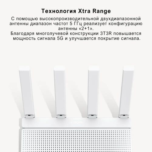 Xiaomi Router AX3000T төрт тышкы антенна менен жабдылган, 5 ГГц тармагы үчүн 2+1 конфигурациясында жана Xtra Range технологиясын колдойт. Бул үйдүн дубалдары аркылуу сигналдын кеңири жетүүсүн жана өткөрүлүшүн камсыз кылып, "өлүк зоналардын" пайда болушун алдын алат.