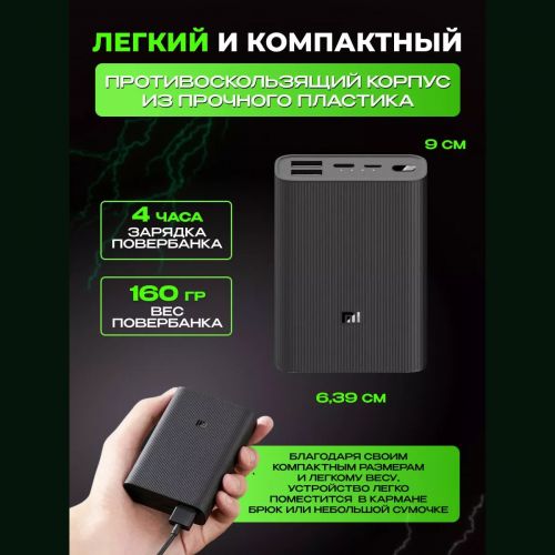 Сверхкомпактный портативный внешний аккумулятор Xiaomi Mi Power Bank 3 Ultra Compact 10 000 мАч - эң компакттуу модель өз сериясынан. Ал сиздин чөнтөгүңүзгө батат, бул аны ар жакка алып жүрүүгө мүмкүнчүлүк берет.