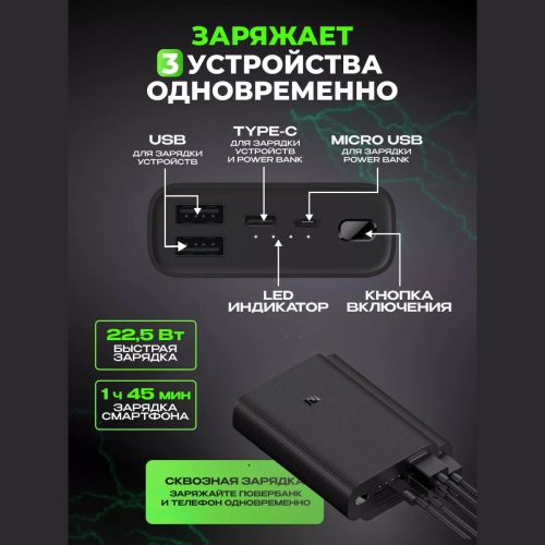 Аккумулятордо 4 туташуу порту бар: 2 USB-A, 1 USB-C, 1 microUSB. Ал өзү microUSB же USB Type-C аркылуу заряддалат.