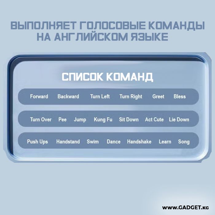 - Үн менен башкаруу: “Sit” (отур), “Stand up” (тур), “Play music” (музыка ойно), “Dance” (бийле), “Jump” (секир) жана башка жөнөкөй буйруктарды тааныйт.