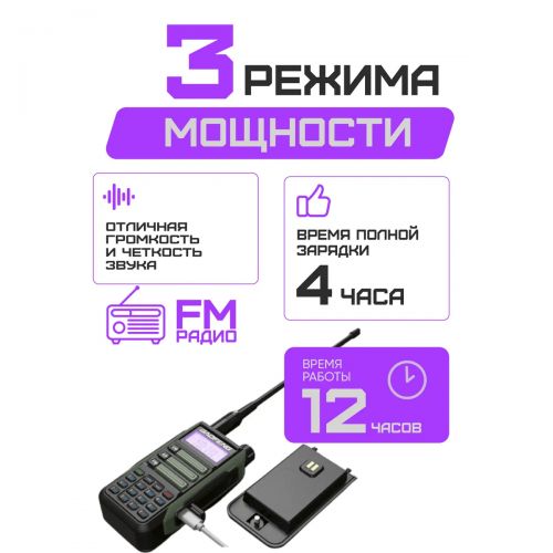 Рация оснащена литий-ионной аккумуляторной батареей высокой емкости 1800 мАч с напряжением 7.4 В, обеспечивая длительное время работы без необходимости частой перезарядки.